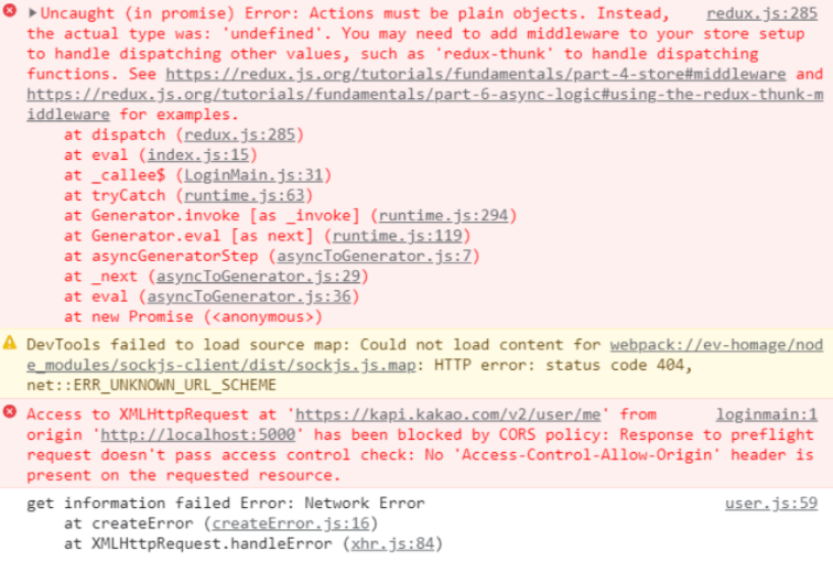이 때 콘솔에서 우리는 CORS 오류가 발생한 것을 볼 수 있다.